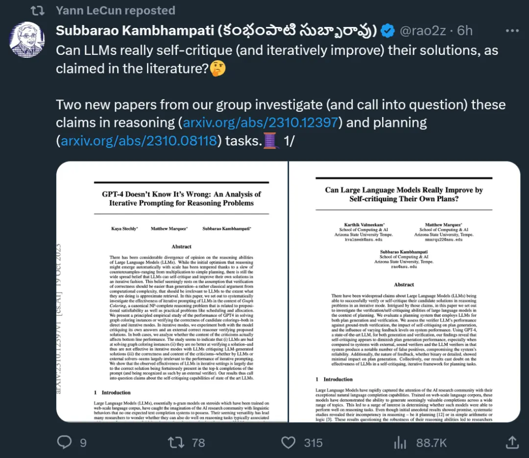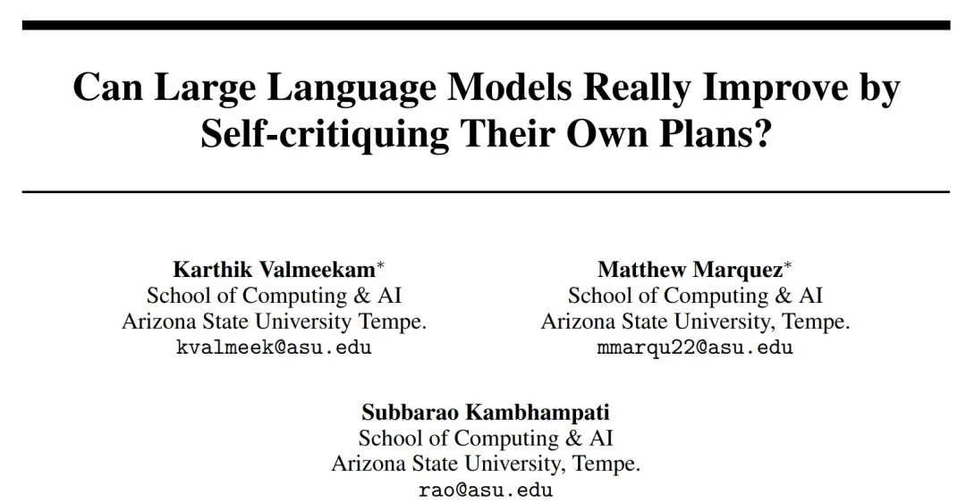 由ASU研究人员发表的两篇论文,驳斥了之前很多研究提出的方法“自我纠正”——让大模型对自己的输出的结果进行自我纠正,就能提高模型的输出质量。