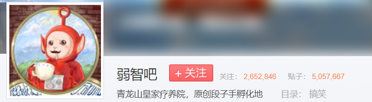 弱智吧自我标榜是搞笑类型的贴吧,如今坐拥两百六十多万粉丝,吧友都统称为弱智病友,其简介为:青龙山皇家疗养院,原创段子手孵化地。