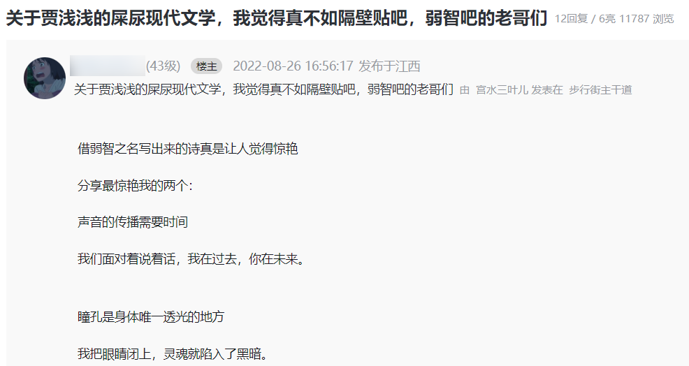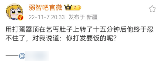 但是贴吧的火爆,也吸引了一批非常高质量的网友入吧,他们做了非常多的新尝试,令人没想到的时候,借助 “ 弱智 ” 为名,一些本身平平无奇的话反而有了发人深省的效果。