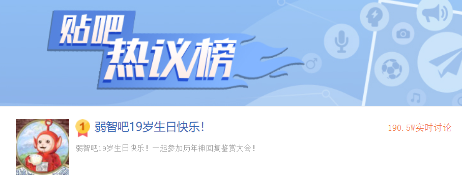这几天,弱智吧又火了,冲上贴吧热议榜第一名。也算不上是啥大事,就是它过 19 岁生日了……在互联网浪潮的冲击下,贴吧像大多数早期网络社区那样呈现出一定颓势,而弱智吧经久不衰,近年越发出圈,颇有成为一种互联网流行文化的趋势,可以说是 “ 后贴吧时代 ” 的一股清流。