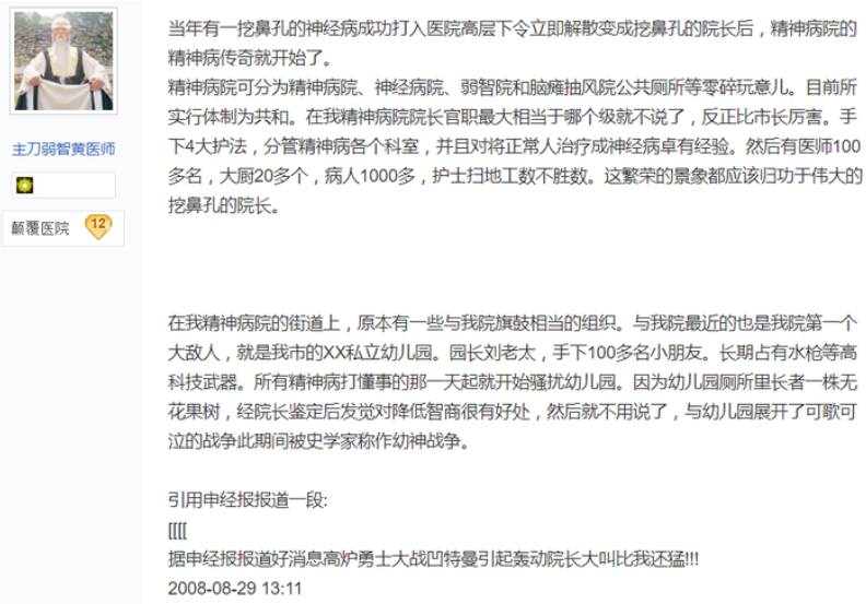 早期的弱智吧是没有吧主的,也经历过一段混沌时期,在早期鼎盛时期,当时一批核心吧友 @ 主刀弱智黄医师、精神病陈医生、挖鼻孔的院长等人为弱智吧创建了非常无厘头的设定。