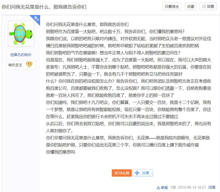 不过,时间来到 2014 年前后,随着名气的变大, “ 弱智吧 ” 也进入了一次分水岭。