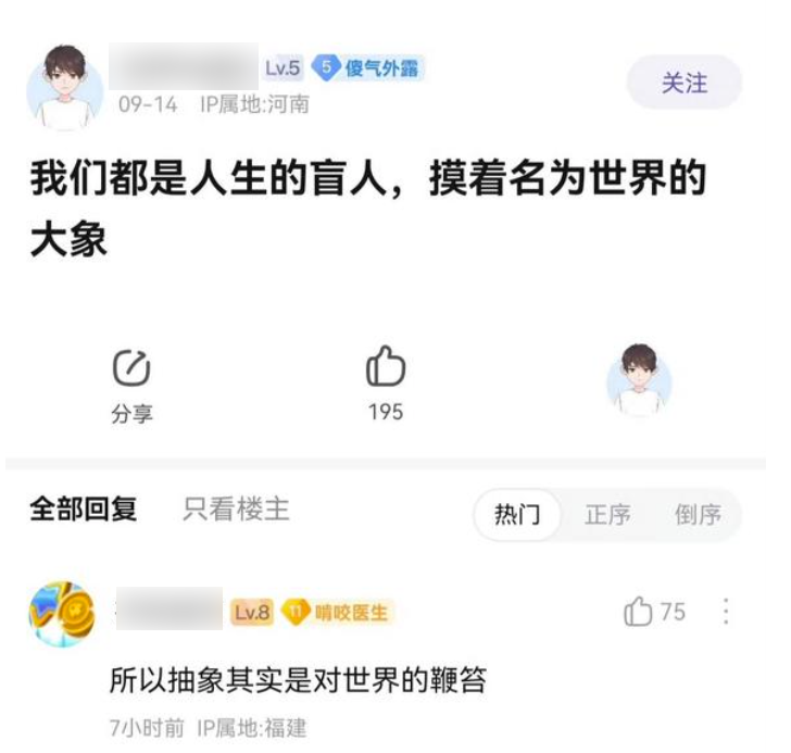 但如果你觉得他们只会讲段子,让人入院、出院,那你就错了,有时候这里的帖子比很多小品还要搞笑,有时却会会让人觉得是悲伤甚至是哲思。