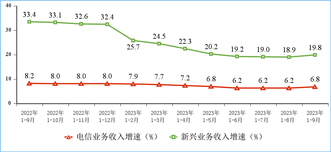 新兴业务收入持续较快增长。三家基础电信企业积极发展IPTV、互联网数据中心、大数据、云计算、物联网等新兴业务,前三季度共完成新兴业务收入2702亿元,同比增长19.8%,在电信业务收入中占比为21.1%,拉动电信业务收入增长3.7个百分点。