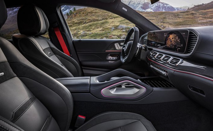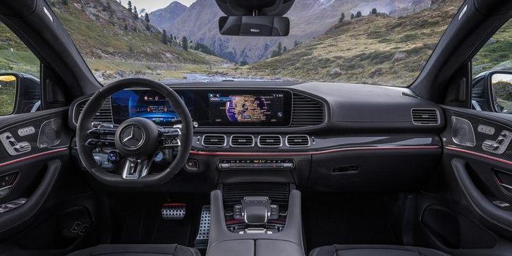 进入车内,新款AMG GLE 53 Hybrid Coupe配备“双翼式”AMG多功能方向盘,采用电容感应式触控技术,操作更加便利,中控面板等细节处换装碳纤维装饰件,进一步提升运动氛围。