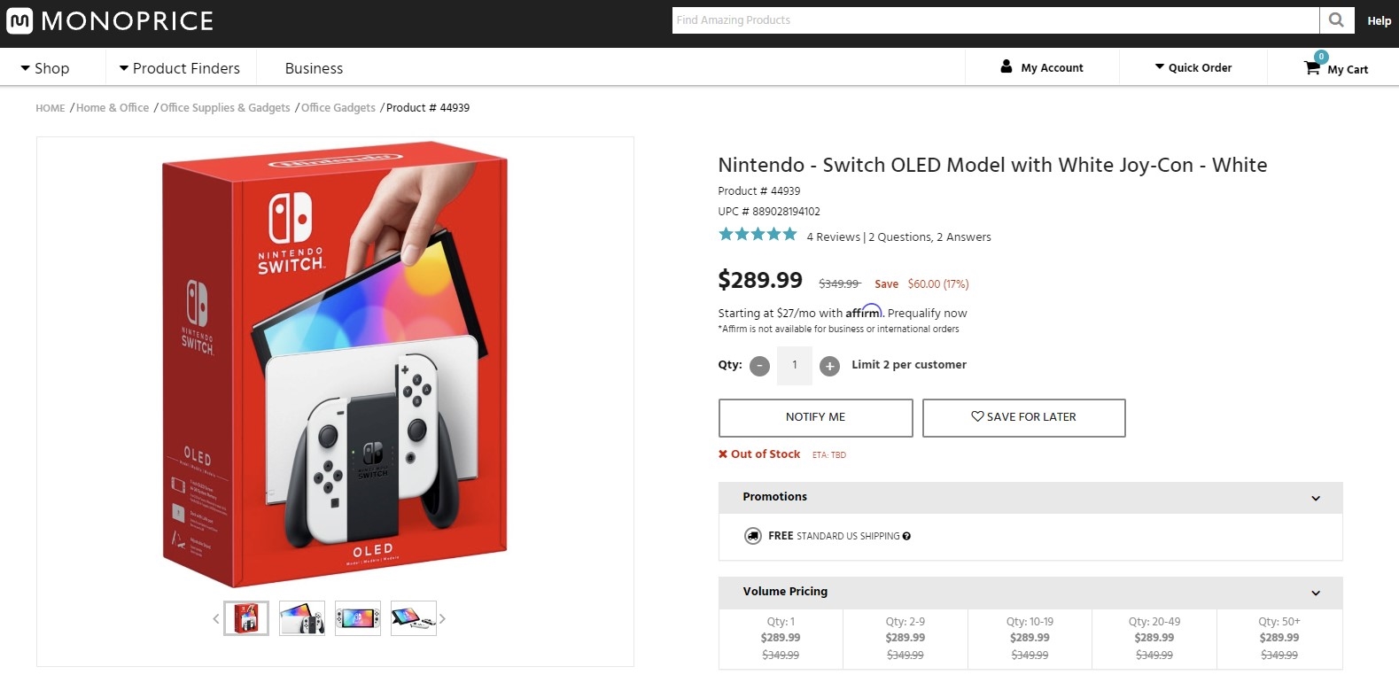 电商平台Monoprice以290美元低价销售任天堂OLED红蓝装及白色版,较建议零售价低了60美元:据说Switch 2明年面市,任天堂在现款Switch销量疲软的情况下不会干涉渠道低价抛售库存,290美元应该是现阶段各方可接受的底价。现在还不清楚Switch 2的发售档期,任天堂内部招聘信息显示,明年夏天安排了大型宣发活动,据此预测新一代Switch将于明年秋面市。