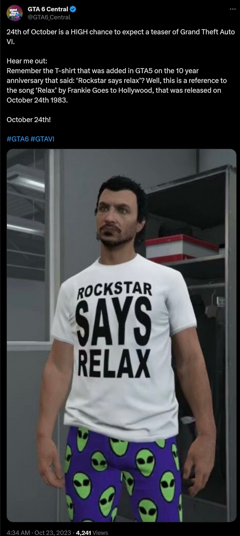 还有人拿出G胖数3的劲头疯狂搜寻一切与6有关的数字组合,比如24号意味着2+4=6;GTA5十周年纪念T恤上写着“Relax”,Relax在这里其实是英国乐队Frankie Goes to Hollywood写的一首歌,这首歌发布于1983年10月24号,所以10月24号有戏!