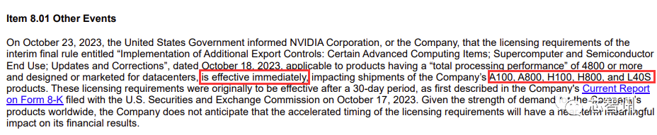 当地时间10月24日,GPU大厂NVIDIA(NVIDIA)在向美国证券交易委员会提交了一份最新的8K文件中表示,美国政府已通知NVIDIA,要求其立即停止A100、A800、H100、H800和L40S产品的发货。