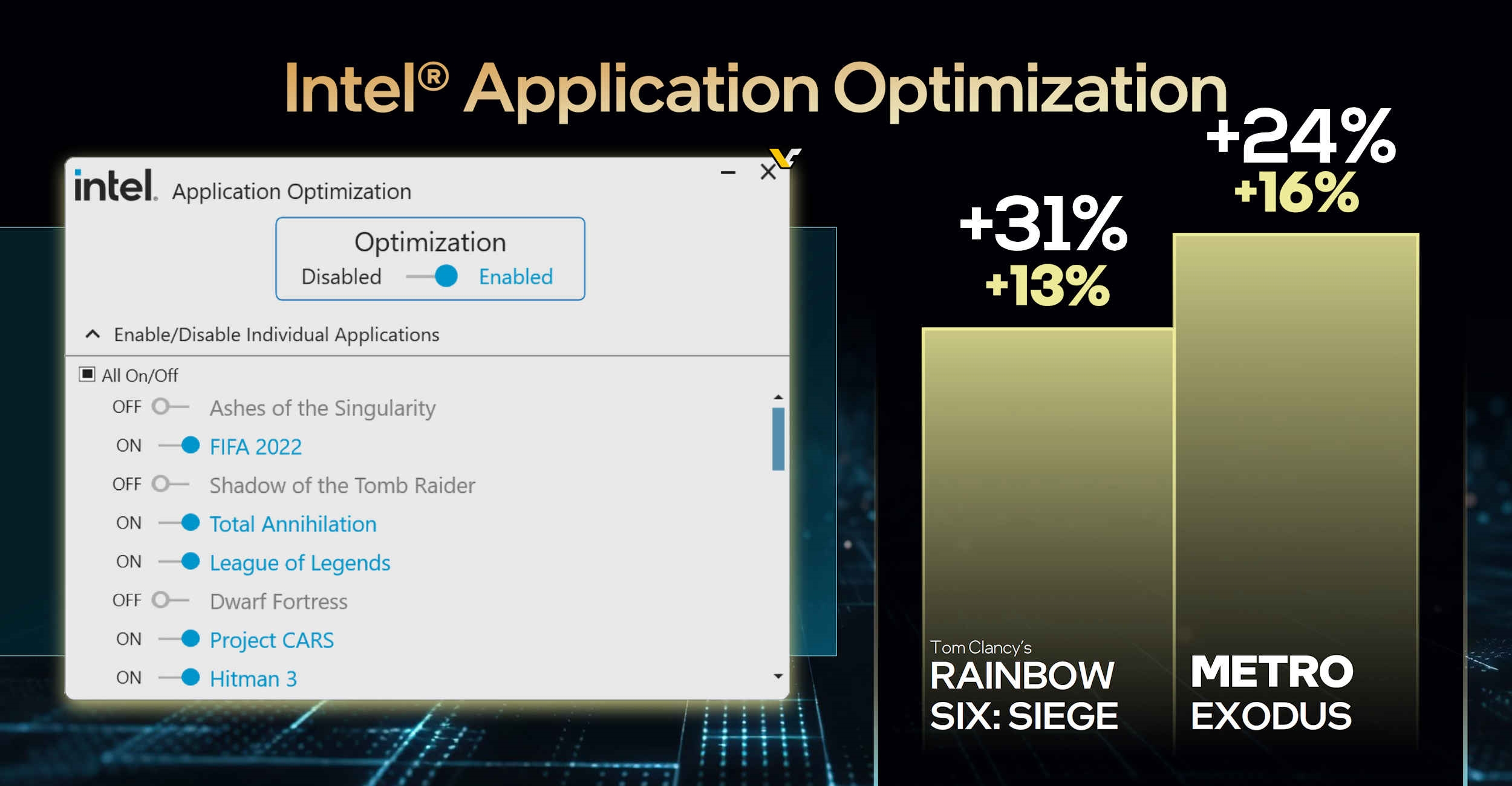 Intel APO技术目前仅支持《地铁:离去》、《彩虹六号:围攻》,官方称可分别带来最多16%、13%的性能提升。