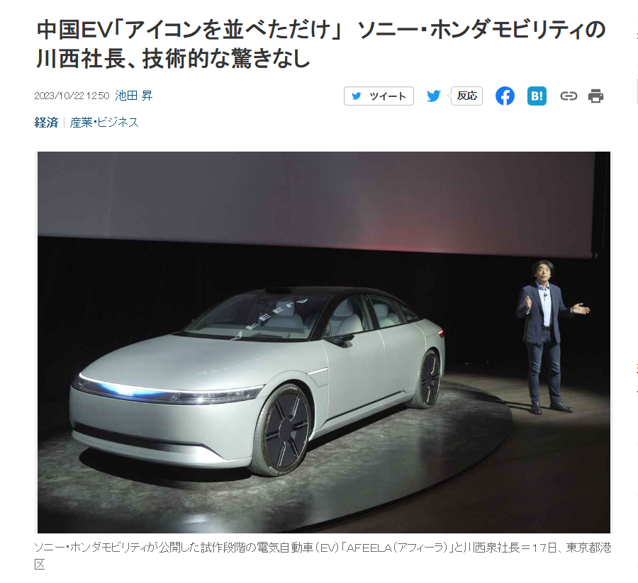 之前公开吐槽中国新能源汽车没有技术含量,索尼本田社长川西泉重申,自己说的话没有错。长川西泉重申自己不会收回观点,中国电动汽车制造商发展速度“有势头”,但信息技术方面,只是排列智能手机图标,目前没有技术惊喜。