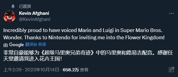 该公司在八月份宣布,曾长期担任马里奥配音的Charles Martinet将离开这一角色。然而,任天堂没有透露接替他的是谁,让粉丝们猜测不已。直到《超级马里奥兄弟:惊奇》发售前几天,我们才从Kevin Afghani的个人社交媒体账号得知他获得了这个角色。