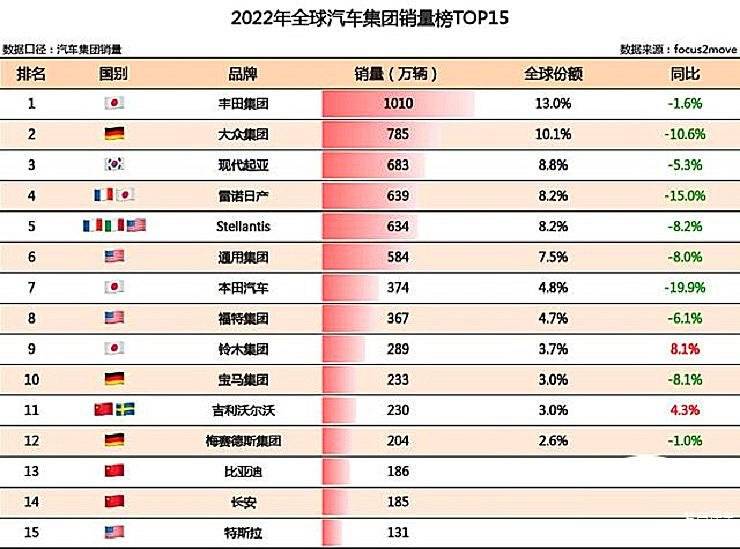 以今年上半年的情况为例:丰田还是全球最畅销的汽车品牌,541万台的总成绩,甩开第二名的大众近100万台的差距。现代起亚、雷诺-日产-三菱、Stellantis、通用集团、福特、本田、铃木分列三到九,比亚迪以126万台的成绩,首次进入“全球前十大车企”序列,距离丰田的差距是415万台。