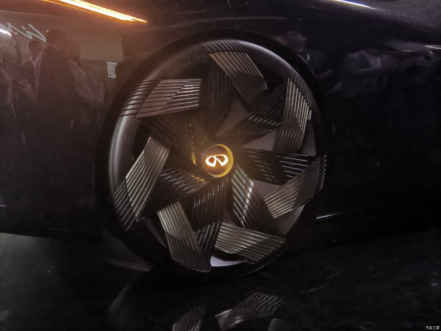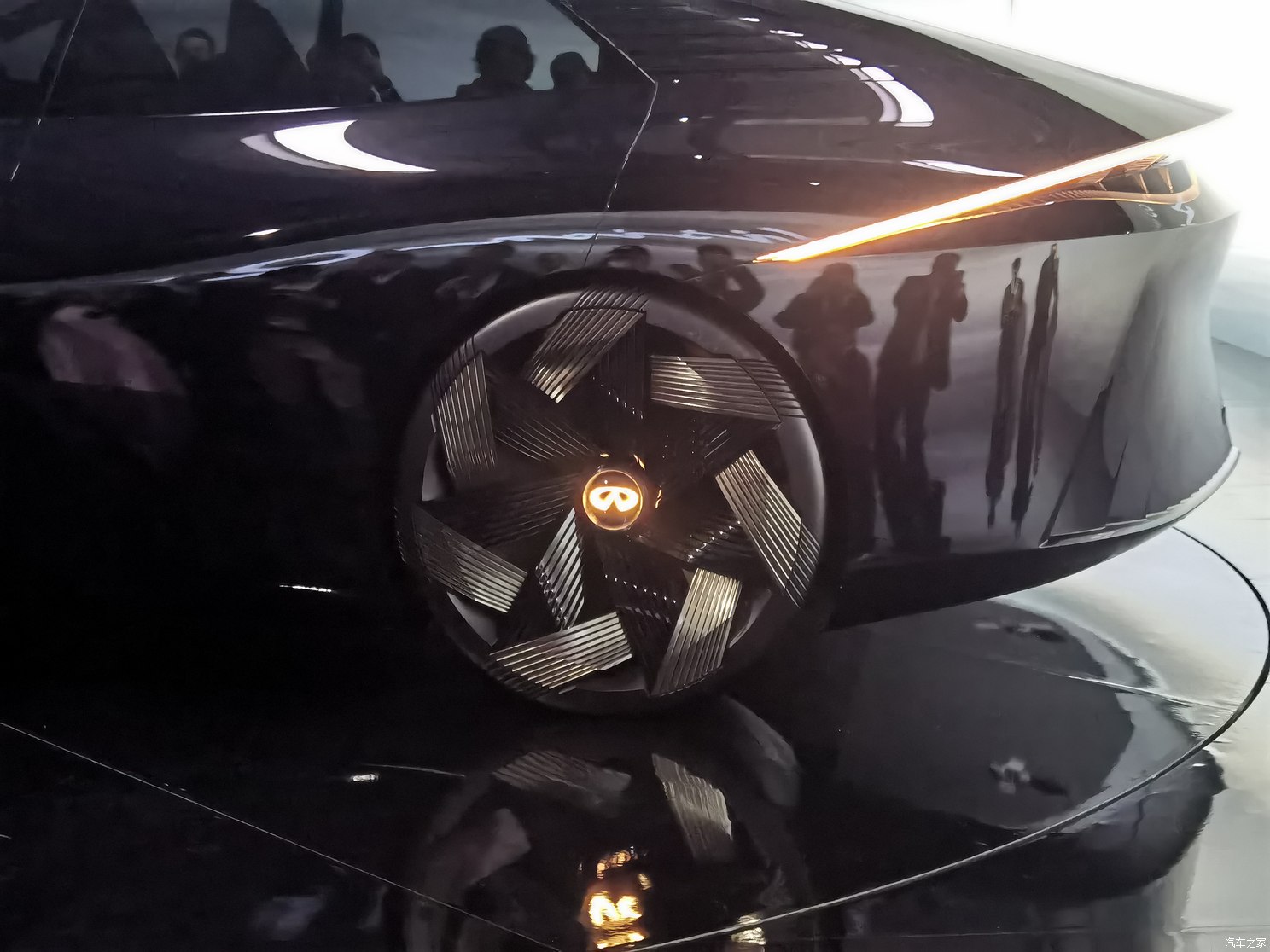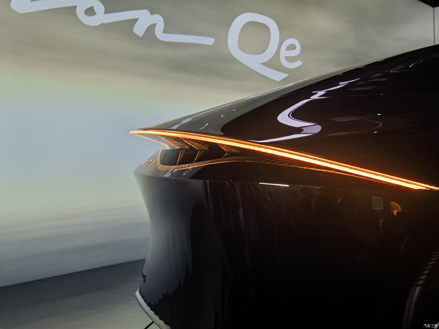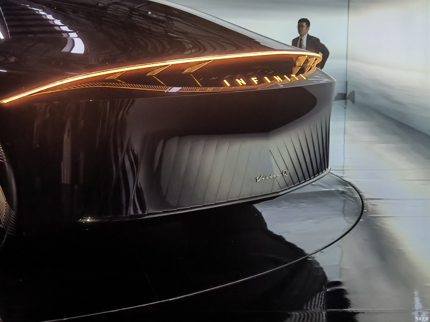 光带式尾灯与前灯组呼应,车尾没有采用英菲尼迪的传统LOGO,而是配备了可发光的INFINITI字母,看起来比较科幻。概念车的设计巧思还体现在后包围处,折纸式的表面点缀着Vision Qe的英文铭牌,非常具有辨识度。