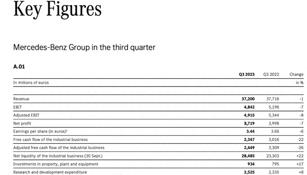 近日,梅赛德斯-奔驰公司公布了2023年第三季度财报,该公司经营收入372亿欧元(当前约2871.84亿元人民币),同比下降1.4%;净利润37.19亿欧元(当前约287.11亿元人民币),同比下降7.0%。