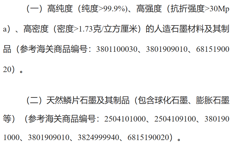 官方也具体列出了商品编号,像什么块状人造石墨、表面处理的球化石墨等等都在其中,也就是说,这次管制受到影响的就这 9 个。