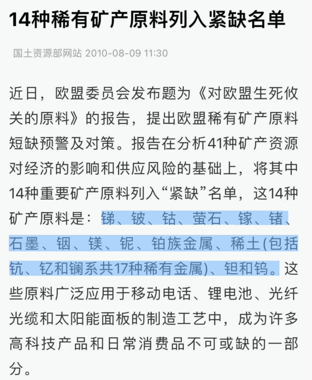 所以大家还是不要太激动,不如看看名单的 14 种矿产原料哪个还没被管控吧。