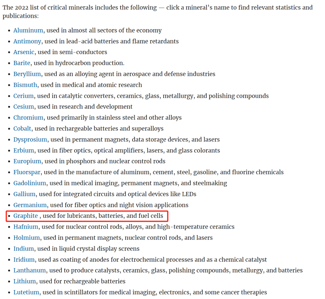 反正,美国和欧洲早早就把石墨纳入了它们14 种紧缺的稀有材料中,去年美国发布的《 2022 年对美国国家安全至关重要的矿物清单 》中,除了我们刚管制的镓和锗之外,石墨就在其中。