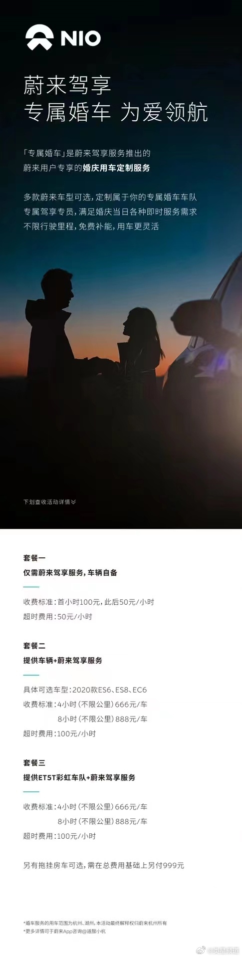 官方称,多款蔚来车型可选,定制属于你的专属婚车车队;专属驾享专员,满足婚庆当日各种即时服务需求;不限行驶里程,免费补能,用车更灵活。