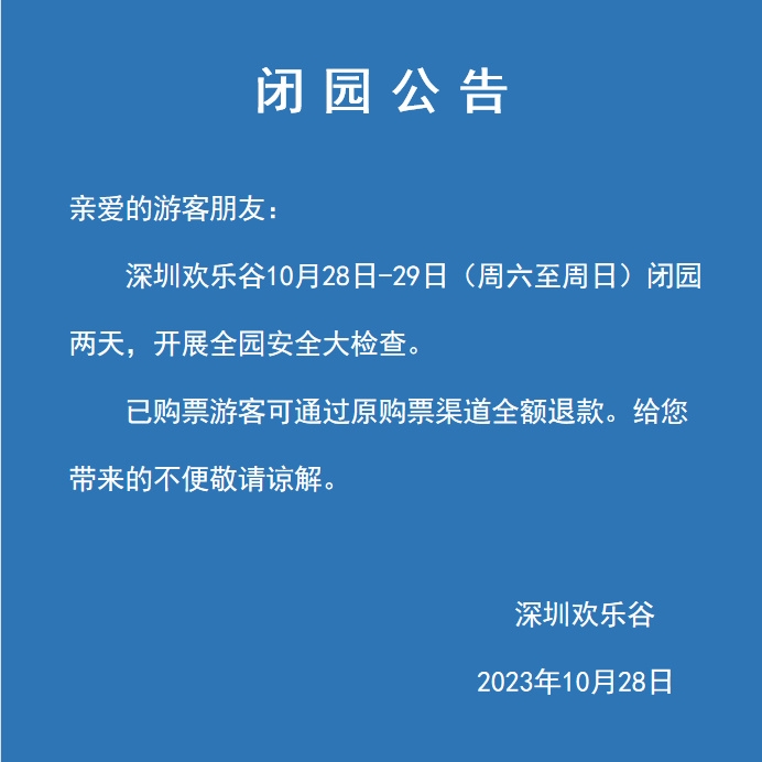 亲爱的游客朋友:深圳欢乐谷10月28日-29日(周六至周日)闭园两天,开展全园安全大检查,已购票游客可通过原购票渠道全额退款,给您带来的不便,敬请谅解。