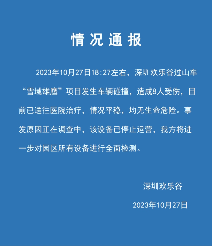 10月28日消息,昨日发生在深圳欢乐谷的“过山车追尾”事故有了进一步的说明。昨天深夜,深圳欢乐谷官方发布情况通报:2023年10月27日18:27左右,深圳欢乐谷过山车“雪域雄鹰”项目发生车辆碰撞,造成8人受伤,目前已送往医院治疗,情况平稳,均无生命危险。