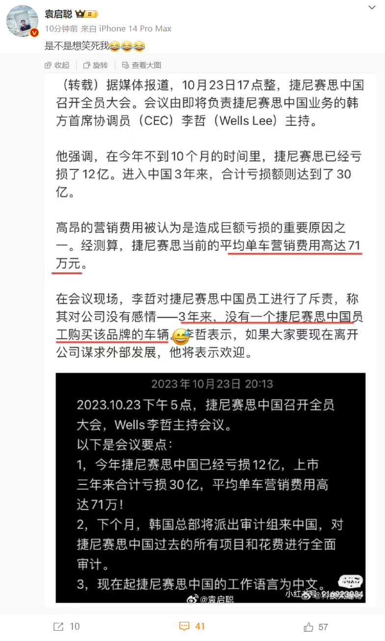 他强调,在今年不到10个月的时间里,捷尼赛思已经亏损了12亿,进入中国3年来,合计亏损额则达到了30亿,平均单车营销成本高达71万元。