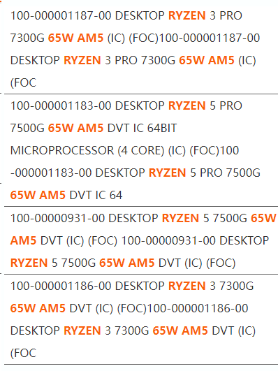 在最新的一份AMD货物清单中,赫然可以看到锐龙7000G的三款型号(也可以说是两款):锐龙5 7500G、锐龙5 PRO 7500G、锐龙3 7300G。
