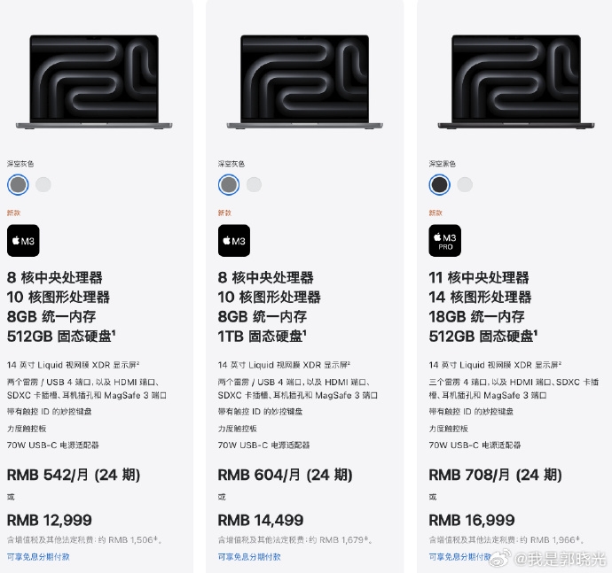 14寸MBP:8+512是12999元、8+1TB是14999元,而18+512(M3 Pro)为16999元;18+1TB(M3 Pro)是19999元