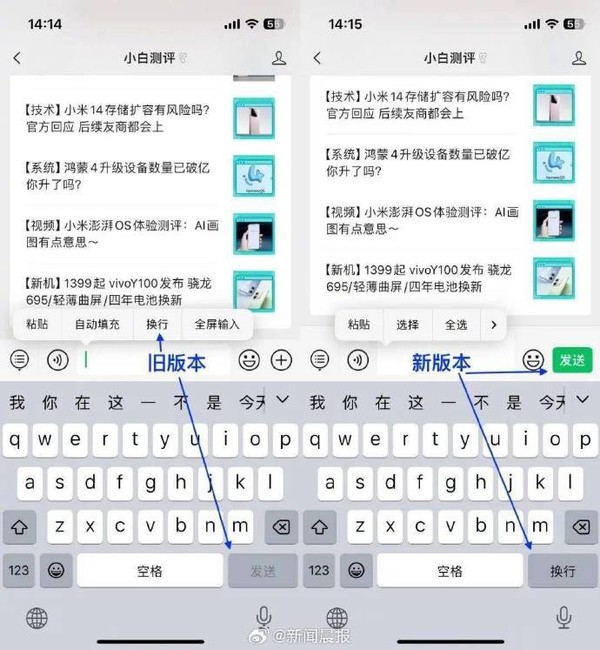 而如今在经过8.0.43版本的更新后,iPhone自带输入法原来的“发送”按键变成了“换行”按键,而对话框右侧则增加了发送键,这样就可以实现一键回车换行了。对使用iOS微信+苹果自带输入法用户来说,属实是“史诗级”更新了,这也算是解决了用户的一个痛点。