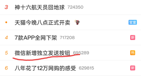 10月31日晚,“微信新增独立发送按钮”这一词条登上了微博热搜,并且高居榜单第五,这让不少人有些纳闷。不过点开后才发现,原来是iOS端微信迎来了一次“史诗级”更新。