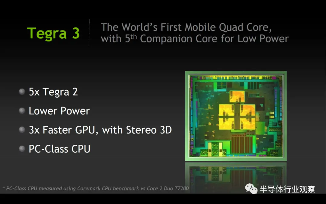 2011年11月,英伟达发布了Tegra 2的继任者Tegra 3处理器,不仅搭载全球首款四核 ARM Cortex A9 CPU,还有升级过后的12 核 GeForce GPU,根据英伟达的宣传,该处理器图形性能最高可达Tegra 2 的 3 倍,功耗却比后者低 61%。