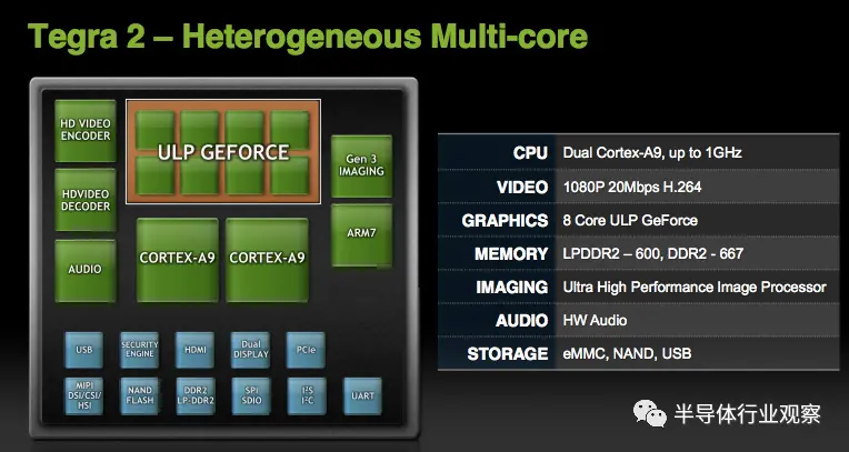 2011年1月,英伟达正式推出了第二代Tegra芯片即Tegra 2,这一代芯片用上了台积电最新的40nm工艺,内置两颗频率为1GHz的ARM Cortex-A9核心,配备GeForce架构的双核GPU,同时还搭载了英伟达自研的音频解码核心与视频编码处理单元。