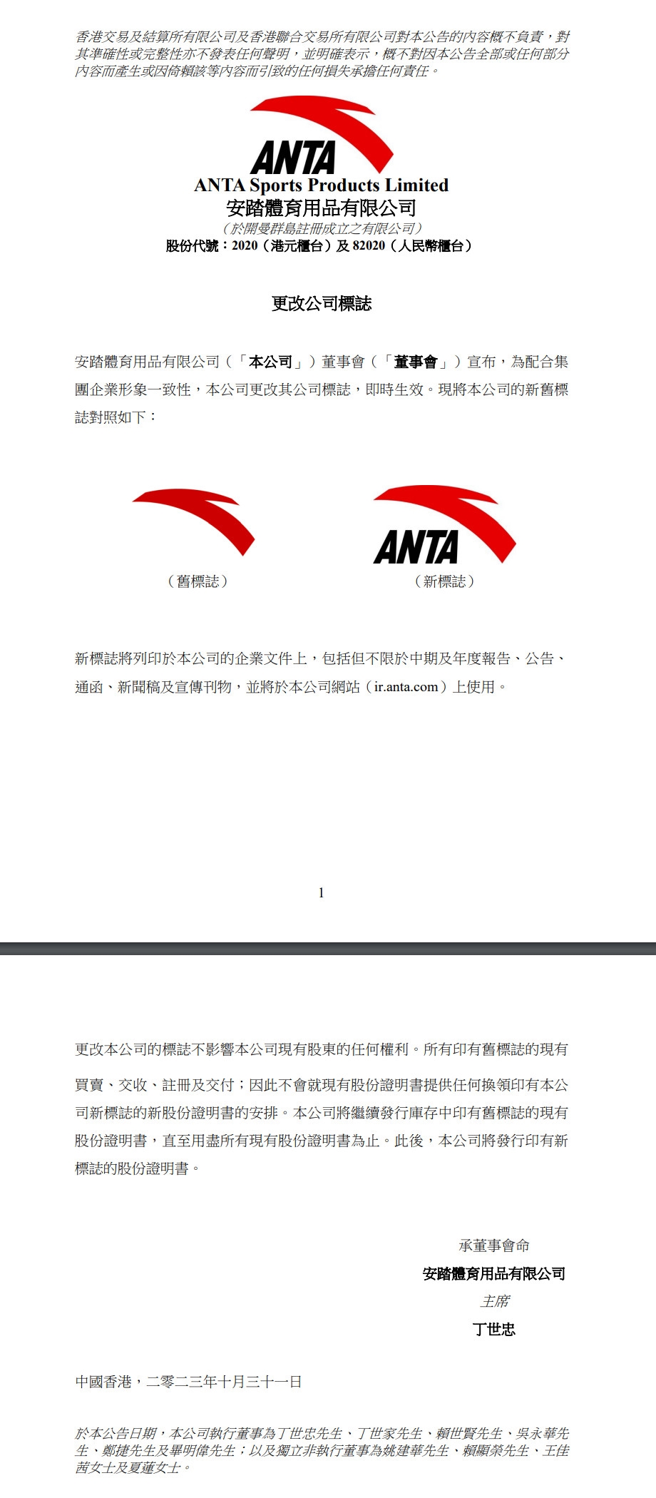 从安踏官网获悉,安踏体育10月31日晚间在港交所公告,宣布更改公司标志。公告称,为配合集团企业形象一致性,公司更改其公司标志,即时生效。新标志将列印于公司的企业文件上,包括但不限于中期及年度报告、公告、通函、新闻稿及宣传刊物,并将于公司网站上使用。