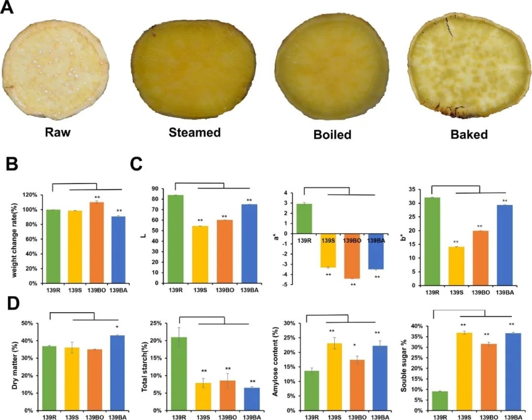 生地瓜、蒸地瓜、煮地瓜和烤地瓜(来源:文献1)研究者还邀请了 10 位志愿者对这些地瓜进行评价。烤地瓜、蒸地瓜和煮地瓜在外观、口感、味道和化学成分方面都有所不同。