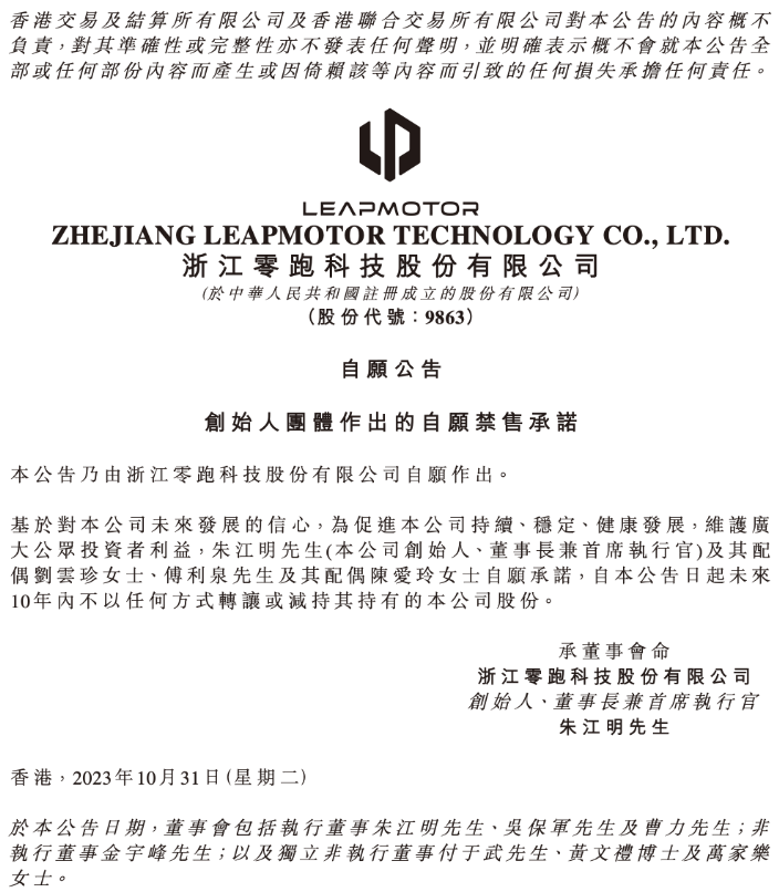 10月31日晚间,浙江零跑科技股份有限公司发布了一则创始人团体作出的自愿禁售承诺公告。公告内容显示,基于对本公司未来发展的信心,为促进本公司持续、稳定、健康发展,维护广大公众投资者利益。朱江明(本公司创始人、董事长兼首席执行官)及其配偶刘云珍、傅利泉及其配偶陈爱玲自愿承诺,自本公告日起未来10年内不以任何方式转让或减持其持有的本公司股份。