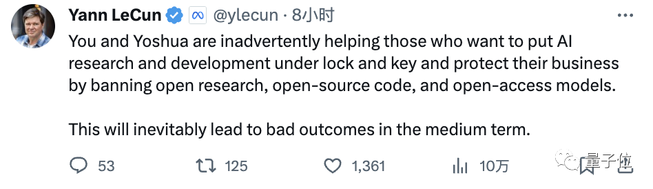 正是你和Yoshua的言论,才让那些想通过禁止开源来保护自己的AI研究和业务的人“得逞”。后果很严重。