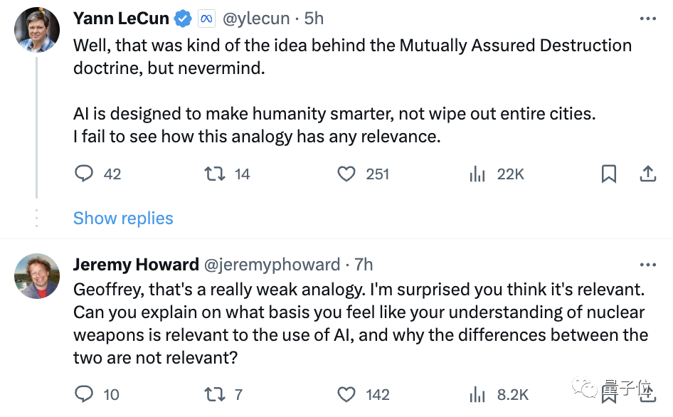 而对于Hinton拿出核武器来和AI做类比,LeCun和fast.ai创始人Jeremy Howard都不能苟同: