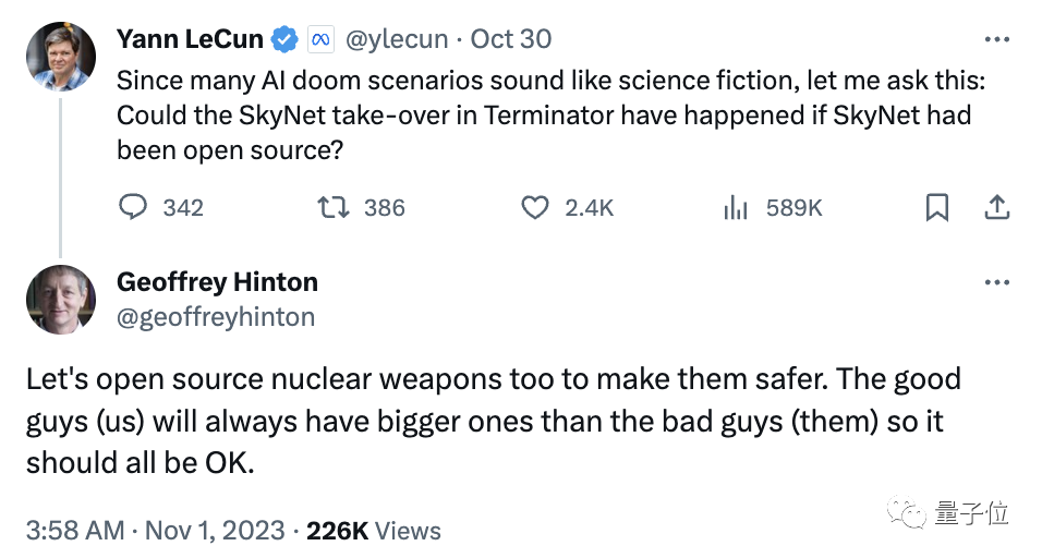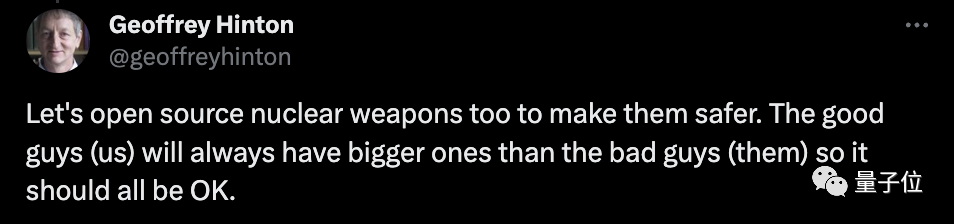 活久见,AI巨佬们撸起袖子线上“对喷”,一“架”直接干上热搜了。Big name一个接一个出现不说:吴恩达、Hinton、LeCun、哈萨比斯……甚至吵到稳如Hinton,都开麦阴阳怪气起来:是是是,好人力量大,我们应该把核武器也给开源了。