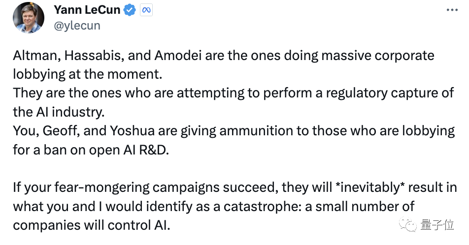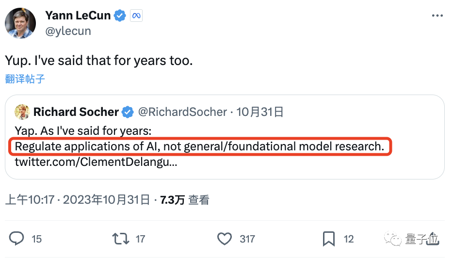 而更早一点,LeCun也转发了关于“大家应该做的,不是在这限制通用/基础大模型技术的研究,而是该去规范其应用”的帖子。