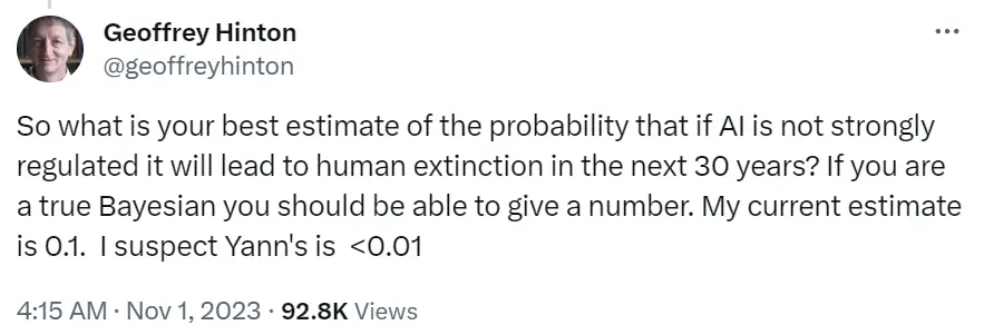 Hinton 还直接在吴恩达的帖子下反问他,如果 AI 没得到很好的监管,那未来 30 年人类灭绝的概率是多少呢?我目前的答案是 0.1 ,你自己心里肯定也有数。