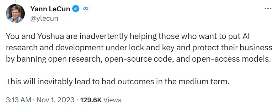 吴恩达的推文呢,就像在瓦斯泄露的房间里点燃了一根火柴,本来整个 AI 圈子在这个话题上的分为都已经剑拔弩张了,这下直接炸了……