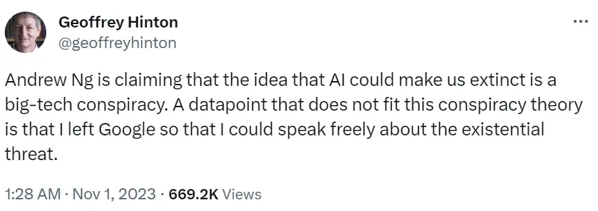 你吴恩达说 AI 有毁灭人类的风险很小,但我 Hinton 当初离开Google,可正是为了能把这些风险说出来。