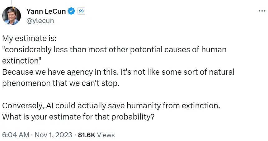 至于 30 年后 AI 导致人类灭绝的问题,也立马召唤出了另一位大佬,也就是吴恩达的 “ 同盟 ” LeCun 。