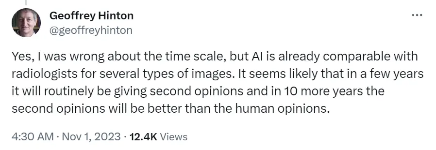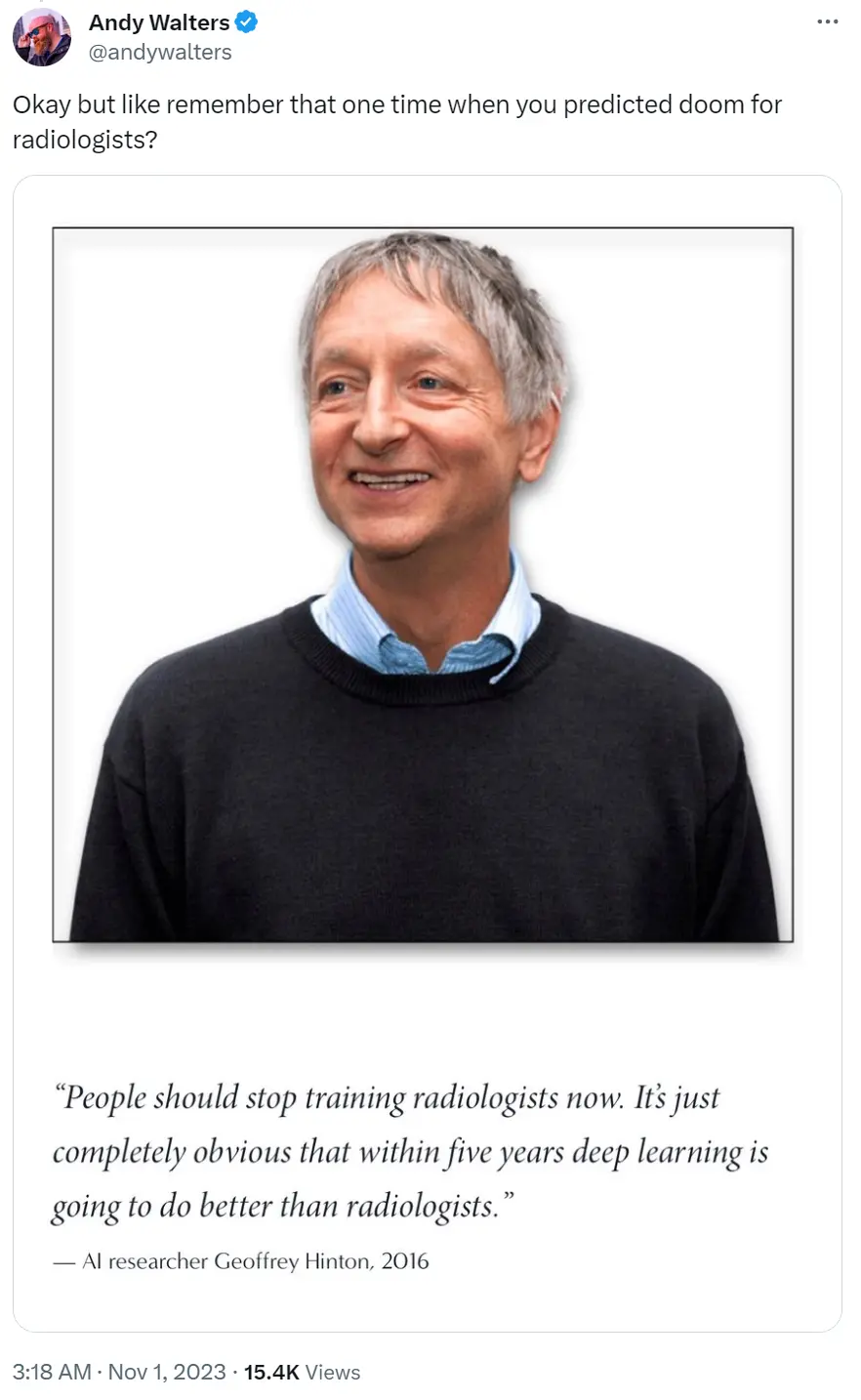 有趣的是,有网友也跟着 LeCun 一起向 Hinton 倒油,挖出之前他在 2016 年预测的放射科医生 5 年内就会被 AI 取代的言论。
