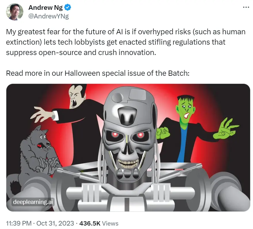 吴恩达还洋洋洒洒地写了一篇长文,先是列了一些现在网上常听到的 “ AI 会让人类灭绝 ” 、 “ AI 会取代多少人的工作 ” 等等的言论。
