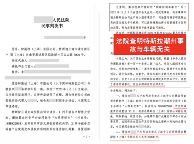 最终,法院一审判决该自媒体在其抖音发布道歉声明并置顶 30 日,向特斯拉公司赔礼道歉、消除影响、恢复名誉,并赔偿特斯拉30000元。