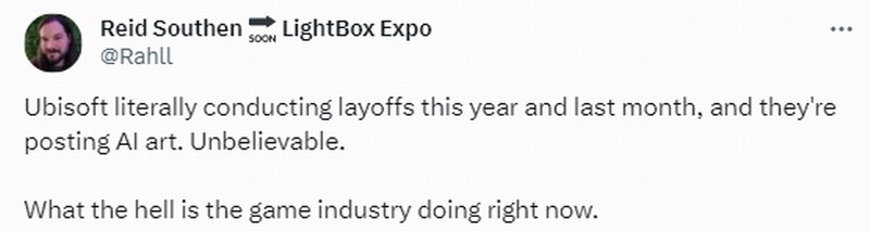 艺术家Reid Southen表示:“今年育碧进行了裁员,而他们正在发布AI作品,真难以置信,现在的游戏行业怎么了?”还有人称育碧有自己的设计师,竟然使用如此廉价的资源......