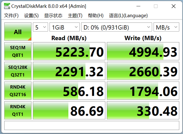 在上机之前,我们先在其他的PC平台对WD_BLACK SN770M 1TB做一个简单直观的测试。Crystal Disk Mark显示,它的顺序读写速度达到了5223.7MB/s和4994.93MB/s,均超过产品标称速度,符合中端PCIe4.0的性能,对于SteamDeck原配产品可以说较大的性能提升。