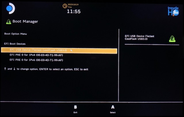 安装好固态硬盘后就可以执行系统的恢复操作了。由于Steam Deck只有一个USB Type-C接口,如果是USB-A接口的普通U盘就需要搭配Type-C扩展坞。连接好系统恢复U盘,按住音量“减”再按电源开机,就会进入EFI系统引导界面,在Boot Manager中选择EFI USB Device,也就是我们的U盘。