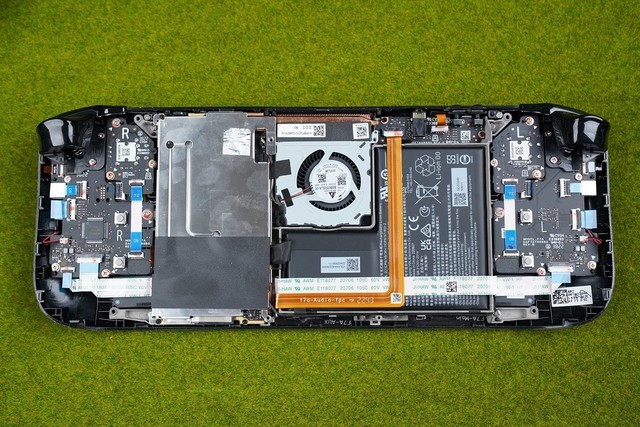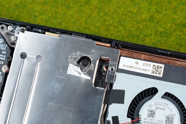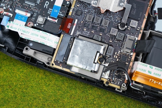 取下金属屏蔽罩后,可以看到固态硬盘的位置靠近机身的下方,外面套着简易的铝箔散热套。由于这台Steam Deck已经被更换了固态硬盘,所以我们拆出来的并非是原装盘,而是一块2230规格的第三方产品,512GB的容量也确实有升级的必要。