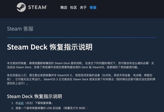 由于全新的固态硬盘没有系统,接下来就是将SteamDeck的SteamOS系统恢复到其中。SteamOS系统恢复包在Steam官网中的“客服”页面下载。传送门在此